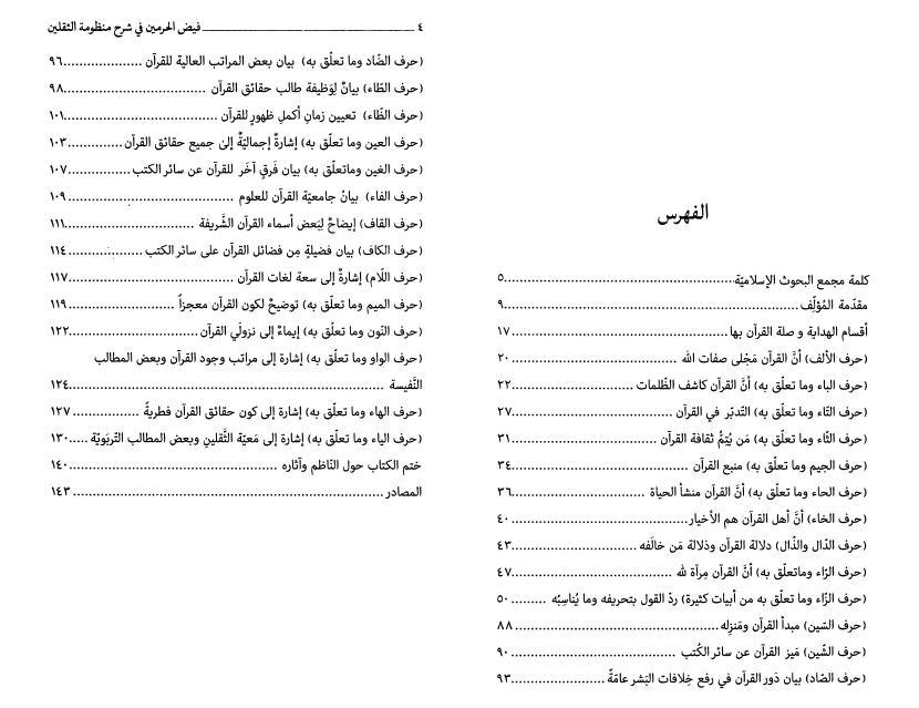 من خلال فهرس الصفحتين (4–5) يظهر أن الكتاب مقسّم إلى ثمانٍ وعشرين فقرة شرحٍ متتابعة، تبدأ من الحديث عن “أقسام الهداية وصلة القرآن بها” وتنتهي بـ“بيان كون الثقلين صنوانًا لا يفترقان”.